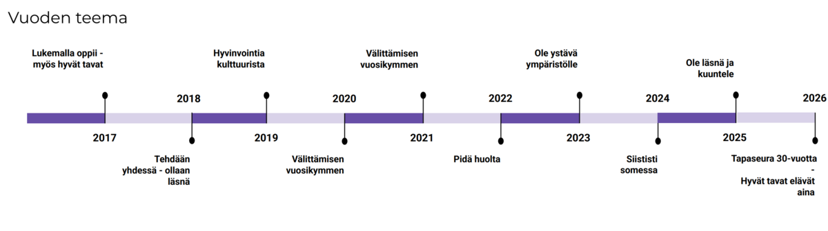 Tapaseura ry valitsee joka vuosi uuden teeman, jonka sisältö tulisi mukailla ajan henkeä, joka myös kuvastaisi yhdistyksen toimintaa ja sen periaatteita.